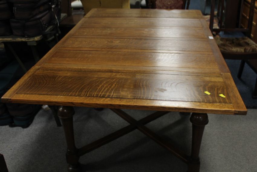 A VINTAGE OAK DRAWLEAF DINING TABLE WITH A SET OF FOUR SIMILAR OAK DINING CHAIRS