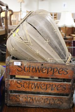 A VINTAGE WOODEN SCHWEPPES CRATE TOGETHER WITH A WICKER STYLE BASKET