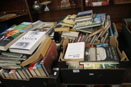 FOUR BOXES OF HARDBACK AND SOFTBACK CRICKET BOOKS