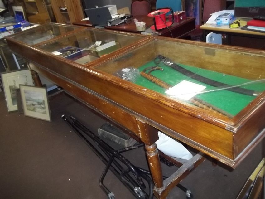 A TRIPLE SHOP JEWELLERY DISPLAY COUNTER ON LEGS WITH LIFT UP TOP (BY ROSTRUM)