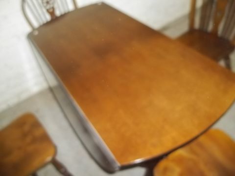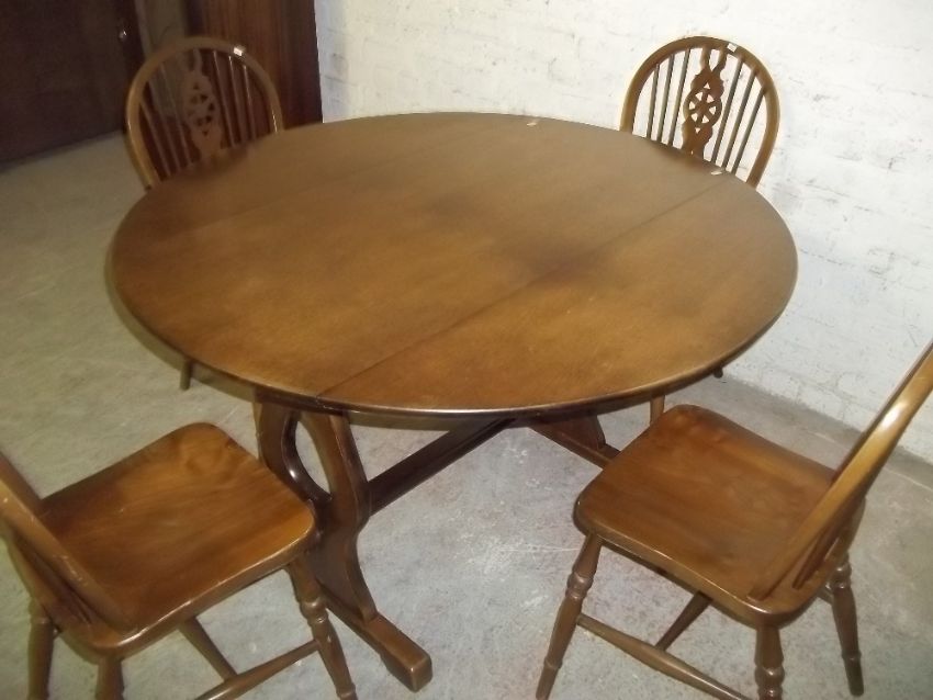 A REPRODUCTION OAK ROUND DROPLEAF TABLE AND FOUR WHEELBACK CHAIRS