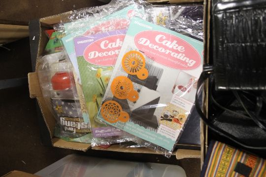 FOUR BOXES TO INCLUDE LPS RECORDS , BOOKS, HANDBAGS AND CAKE DECORATION MAGAZINES