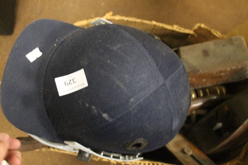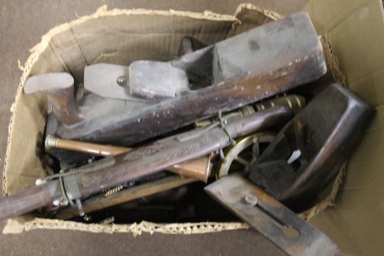 TWO BOXES TO INCLUDE CRICKET HELMET, VINTAGE BLOCK PLANE, COPPER HORN ,SHIRE HORSE WITH CART AND 11 PICTURES AND TWO ENGRAVINGS