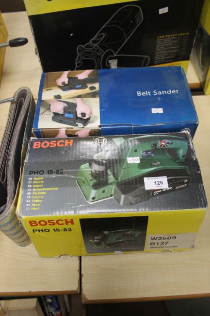 A BOSCH PH01582 PLANER TOGETHER WITH A NEWPOWER BELT SANDER WITH A ROLL OF SHEETS A/F