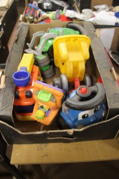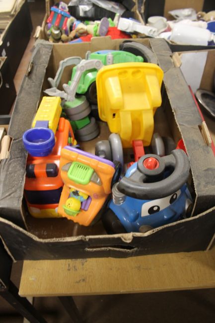 4 TRAYS TO INCLUDE EARLY LEARNING PLASTIC TOYS, BUZZ LIGHTYEAR FIGURE ETC