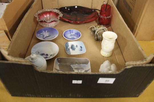 TRAY OF CHINA AND GLASS TO INCLUDE ROYAL DOULTON FLAMBE DISH, BELLEEK AND ROYAL COPENHAGEN TOGETHER WITH A PAIR OF OPERA GLASSES