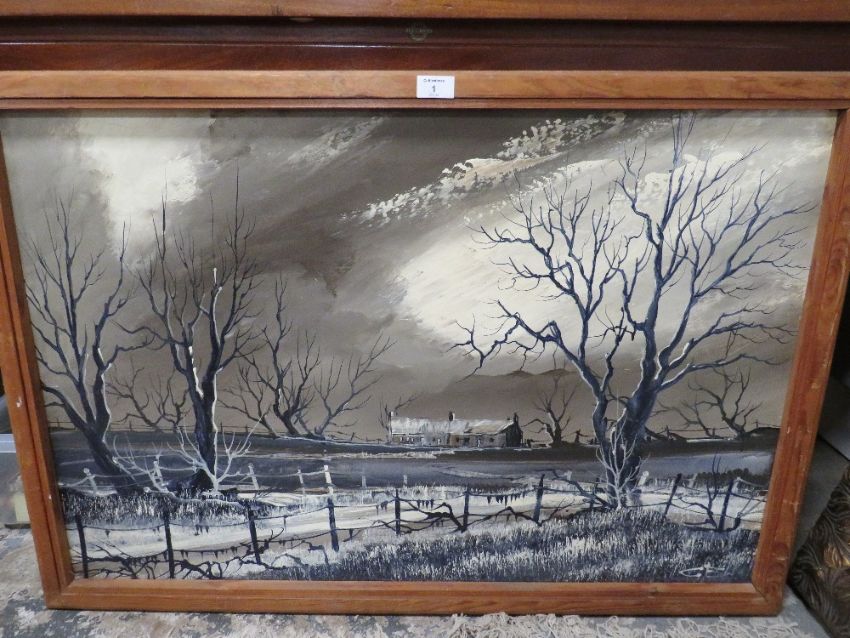 A LARGE ATMOSPHERIC OIL ON BOARD OF A MOON LIT WINTER SCENE INITIALED LOWER RIGHT CB