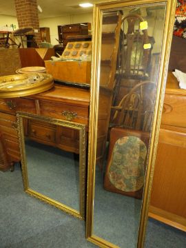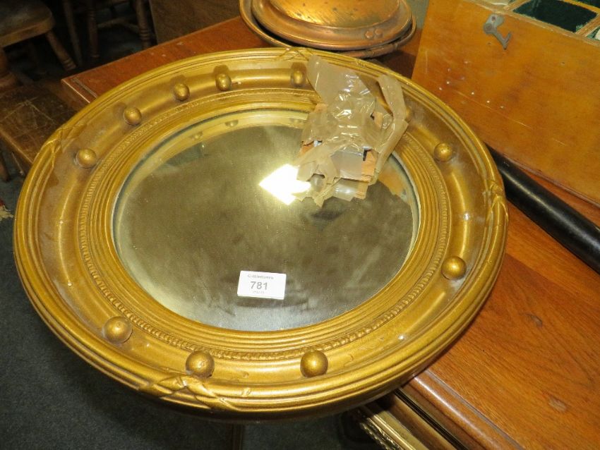 A GILT CIRCULAR MIRROR, VASE, WARMING PAN, TWO MIRRORS AND A BOX