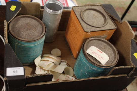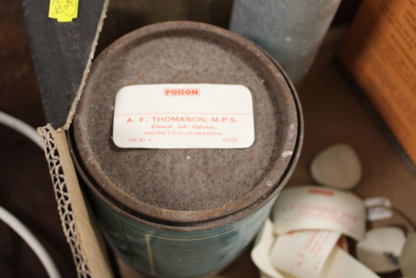 A SMALL TRAY OF CHEMISTS TINS AND LABELS ETC