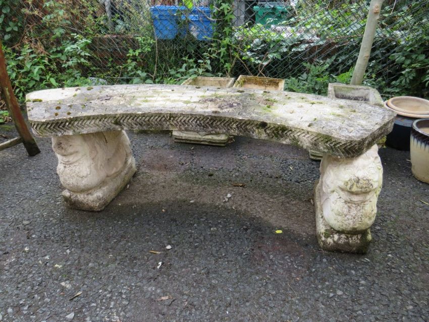 A CURVED CONCRETE GARDEN SEAT WITH LION PLINTHS