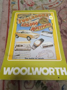 VINTAGE DOUBLE SIDED CARDBOARD SIGN FOR WOOLWORTHS TOBLERONE £25,000 AUCTIONS