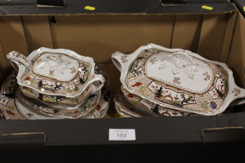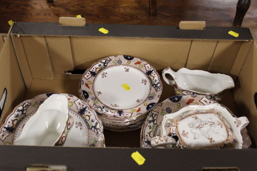 THREE TRAYS OF ANTIQUE CERAMIC DINNERWARE TO INCLUDE TUREENS, MEAT PLATES ETC