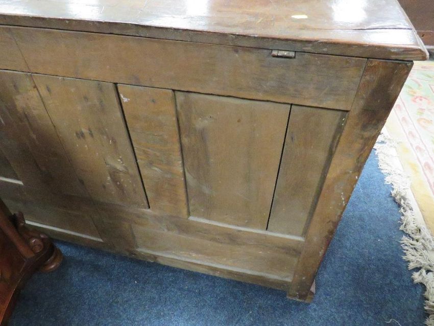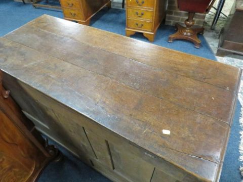 AN OAK MULE CHEST, the hinged lid above a fielded triple panel front with two drawers below, raised on bracket feet, H 84 cm, W 128 cm, D 55 cm