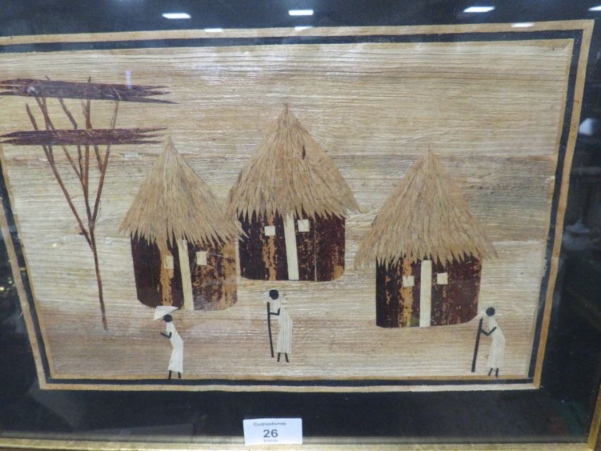 FOUR GILT FRAMED AND GLAZED AFRICAN MIXED MEDIA TRIBAL AND VILLAGE SCENES