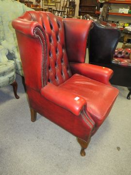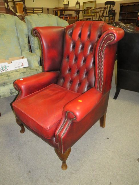 AN OXBLOOD RED LEATHER CLASSICAL WINGBACK ARMCHAIR