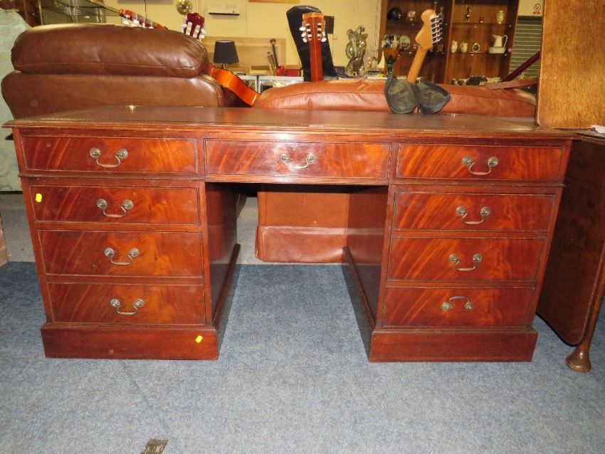 A REPRODUCTION MAHOGANY LEATHER TOPPED TWIN PEDESTAL DESK W-159 CM