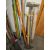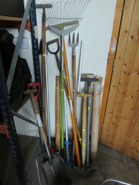 A LARGE SELECTION OF GARDEN TOOLS WITH A SET OF CHIMNEY / DRAIN RODS
