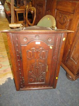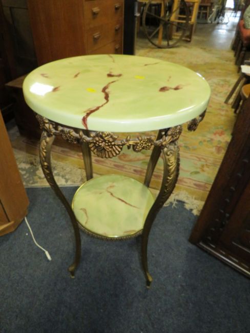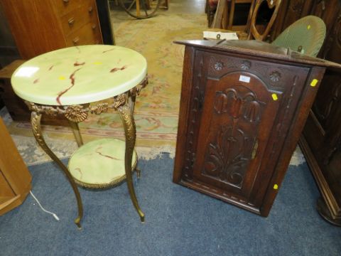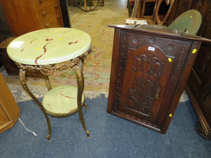 AN ANTIQUE CARVED HANGING CORNER CUPBOARD AND AN ONYX EFFECT TABLE (2)
