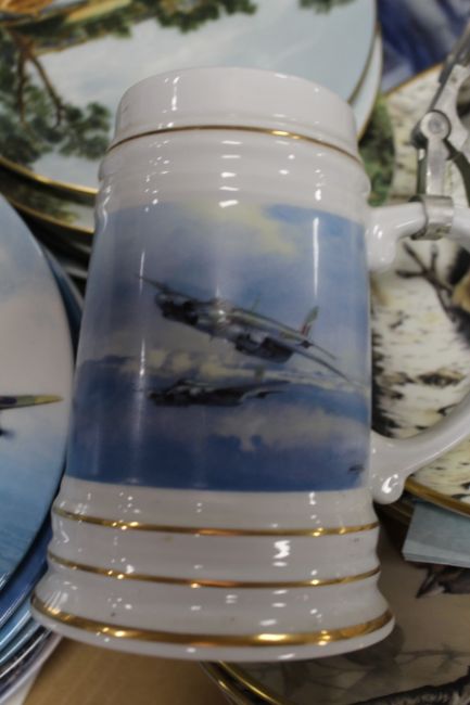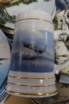 A TRAY OF RAF COMMORATIVE CERAMICS TO INCLUDE TANKARDS AND COLLECTORS PLATES TOGETHER WITH ORNITHOLOGICAL PLATES ETC