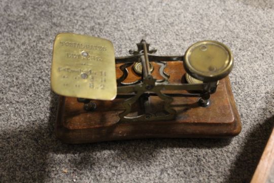 A SMALL SET OF SCALES TOGETHER WITH A SET OF WEIGHTS