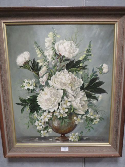THOMAS G. HILL (XIX). A floral still life study of white flowers in a vase, signed lower right, dated verso 1978, oil on canvas, framed, 60 x 50 cm