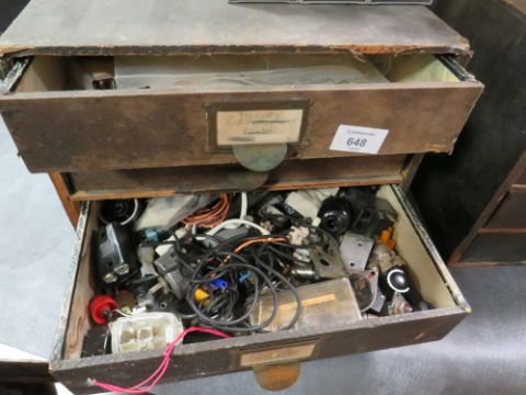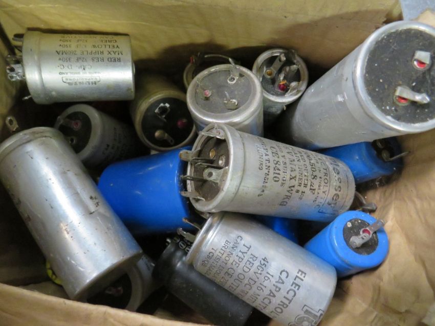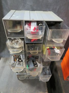 FOUR CABINET DRAWERS CONTAINING VARIOUS ELECTRONIC COMPONENTS, FITTINGS AND A BOX OF CAPACITORS
