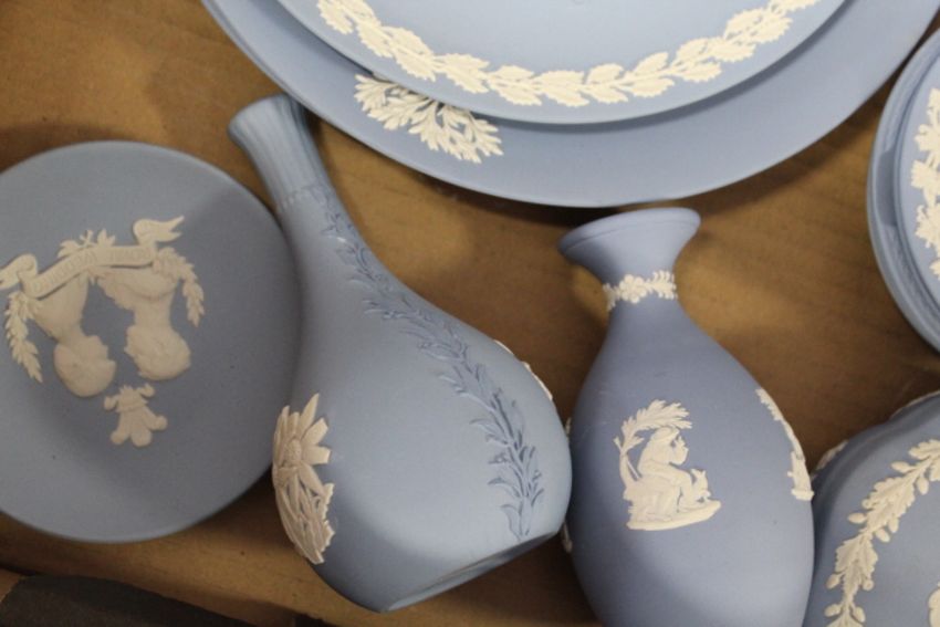 A TRAY OF ASSORTED WEDGWOOD JASPERWARE TO INCLUDE A VASE