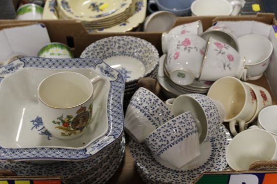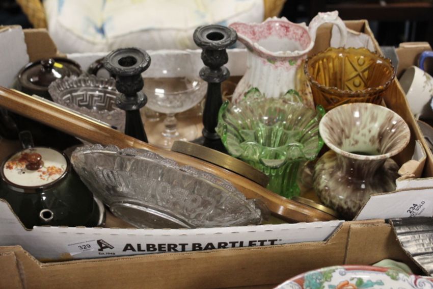 FOUR TRAYS OF CERAMICS AND GLASS ETC TO INCLUDE AN ANTIQUE TUREEN