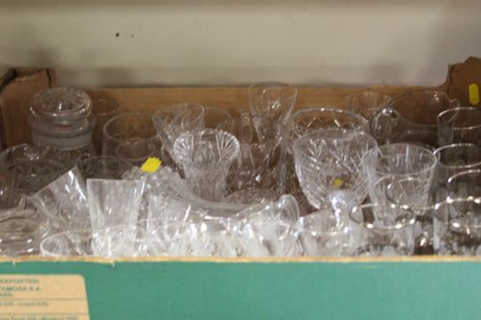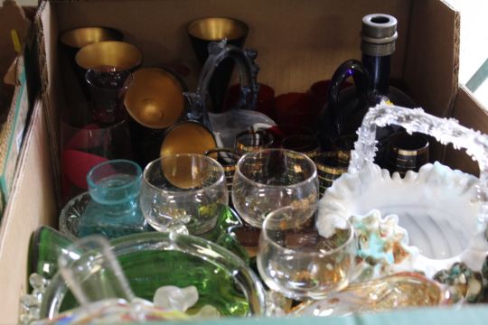 A TRAY OF ASSORTED COLOURED GLASS TOGETHER WITH A TRAY OF ASSORTED DRINKING GLASSES ETC (2)