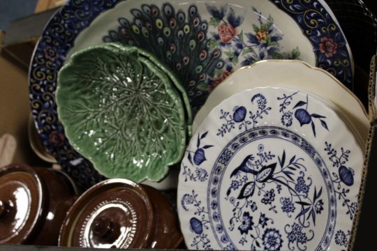 TWO TRAYS OF ASSORTED CERAMICS TO INCLUDE PORTMEIRION AND AN ANTIQUE PLATTER WITH A PEACOCK DESIGN