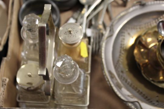 A TRAY OF ASSORTED METALWARE TO INCLUDE CANDLESTICKS