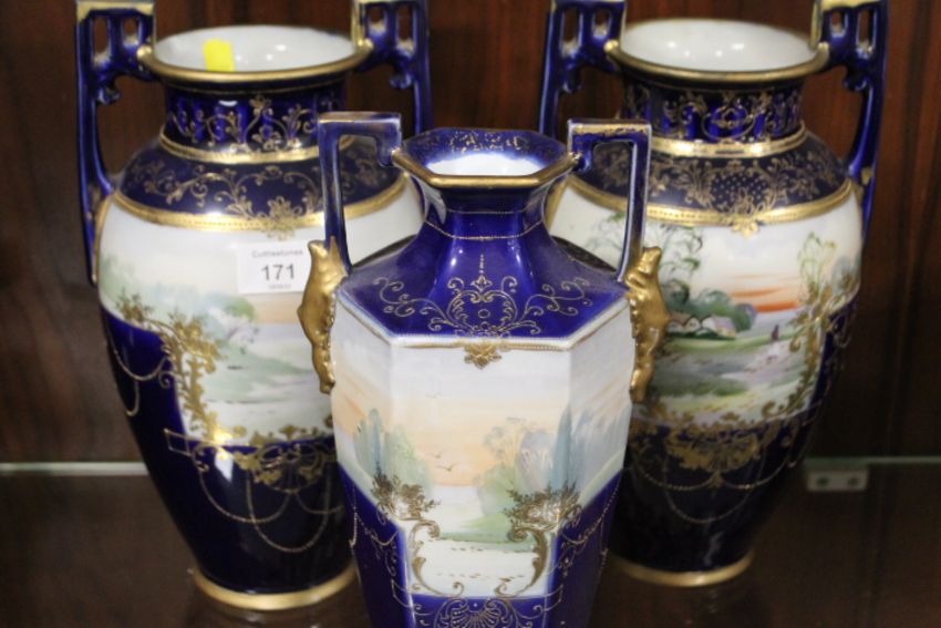 THREE DECORATIVE ANTIQUE VASES WITH HAND PAINTED DETAIL