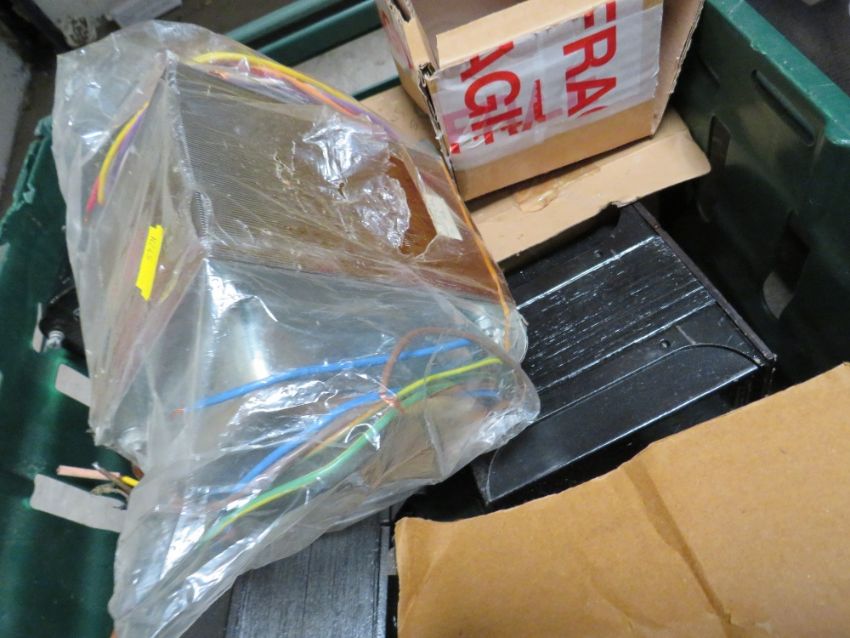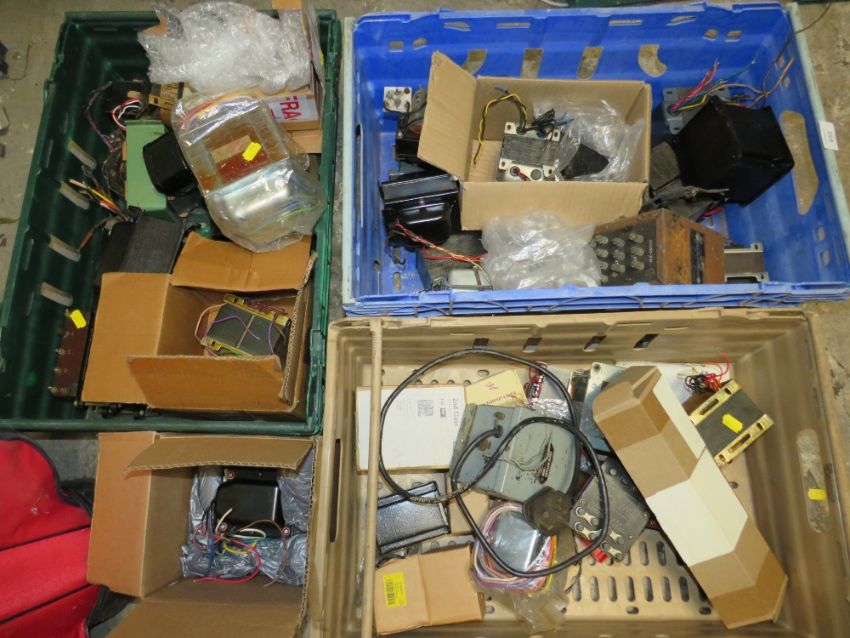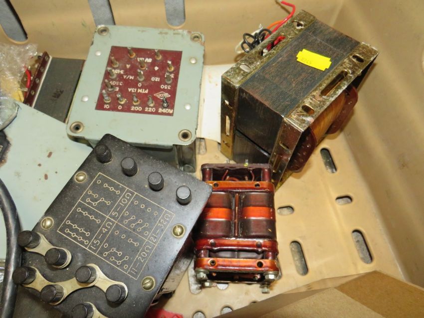 TWO TRAYS CONTAINING AN ASSORTMENT OF LARGE ELECTRICAL TRANSFORMERS
