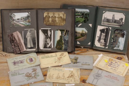 TWO VINTAGE POSTCARD ALBUMS TO INCLUDE STOKE-ON-TRENT AND SURROUNDING AREA EXAMPLES TOGETHER WITH A SELECTION OF CIGARETTE CARD ALBUMS
