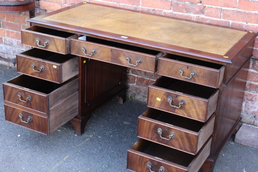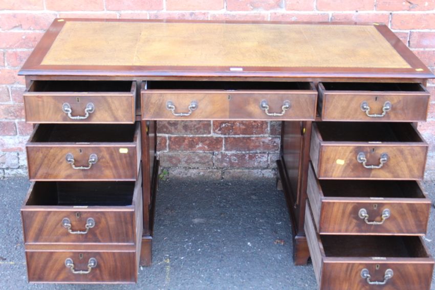 A REPRODUCTION MAHOGANY LEATHER TOPPED TWIN PEDESTAL DESK - W 137 CM
