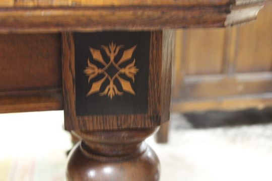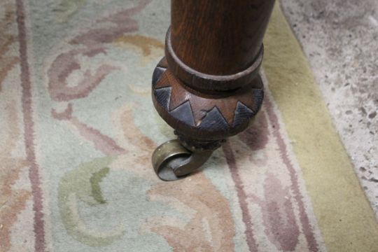 A LARGE VICTORIAN EXTENDING WIND-OUT DINING TABLE WITH TWO SPARE LEAVES - EBONISED WITH FLORAL DETAILS TO THE LEGS - H 72 CM, L 124 CM, EXTENDED L 238 CM (HANDLE)