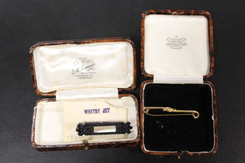 A 9C GOLD STOCK PIN APPROX 4,5G TOGETHER WITH A WHITBY JET BROOCH ( BOTH IN VINTAGE BOXES )