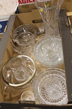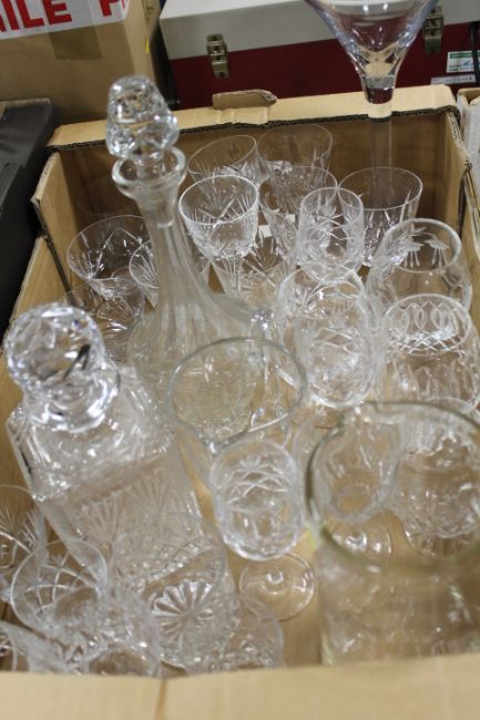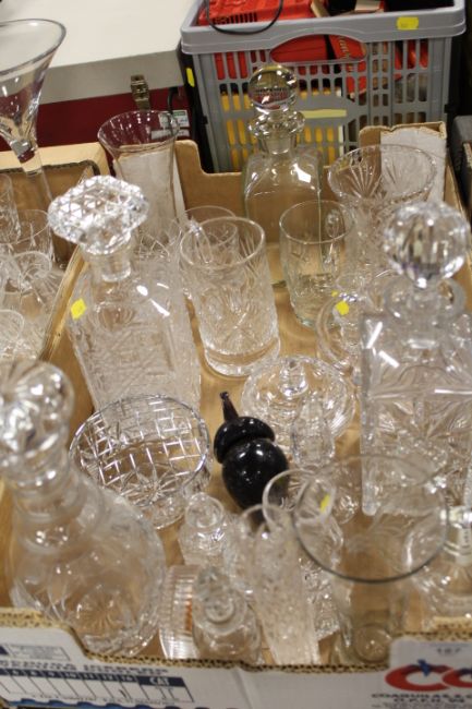 THREE TRAYS OF ASSORTED GLASS WARE TO INCLUDE VASES, DECANTER ETC