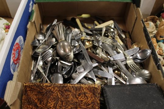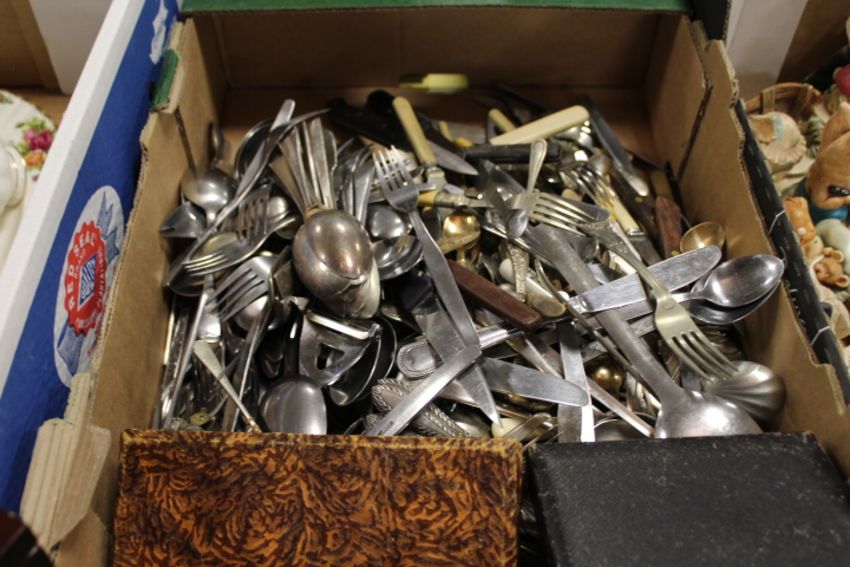 A TRAY OF ASSORTED FLATWARE TO INCLUDE TEA SPOON COLLECTORS DISPLAY AND CONTENTS