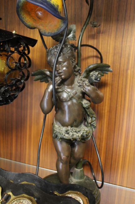 A SPELTER CHERUB TABLE LAMP, A PAIR OF MATCHING BLACK METAL TABLE LAMPS AND THREE HORSE BRASS LEATHER STRAPS (LAMPS IN WORKING ORDER ON CONSIGNMENT)