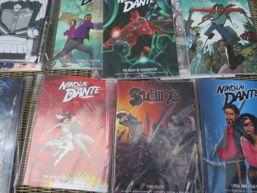 A BOX OF APPROXIMATELY 30 COMIC BOOKS, TO INCLUDE NIKOLAI DANTE, SLAINE BOOKS OF INVASIONS VOLUMES 1 TO 3 AND 2000AD JUSTICE DEPARTMENT NOTEBOOK