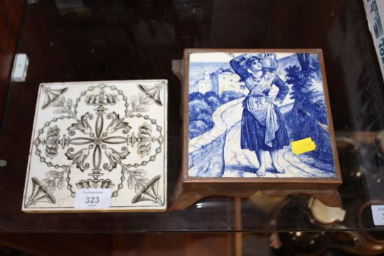 A MINTON AND HOLLANDS MONOCHROME TILE TOGETHER WITH A BLUE AND WHITE MINTONS TILE IN COPPER MOUNTING (BADLY DAMAGED)