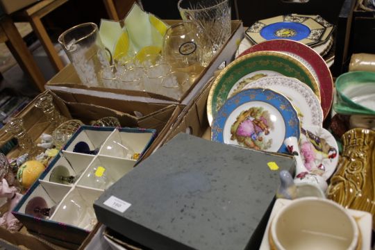 THREE TRAYS OF CERAMIC AND GLASS ETC TO INCLUDE A HANKER-CHIEF VASE
