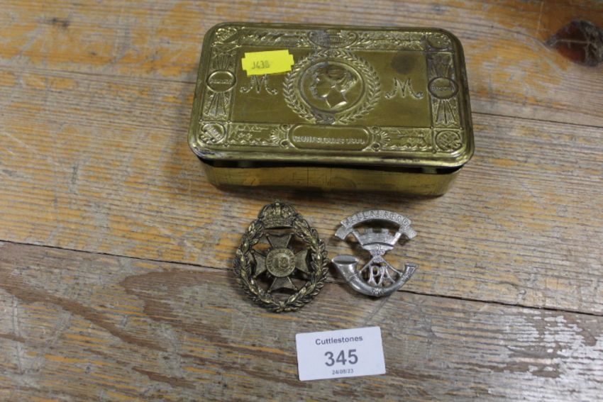 A WW1 PRINCESS MARY TIN CONTAINING TWO MILITARY BADGES