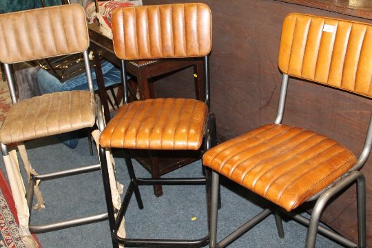 A HARLEQUIN SET OF THREE LEATHER BAR / KITCHEN STOOLS