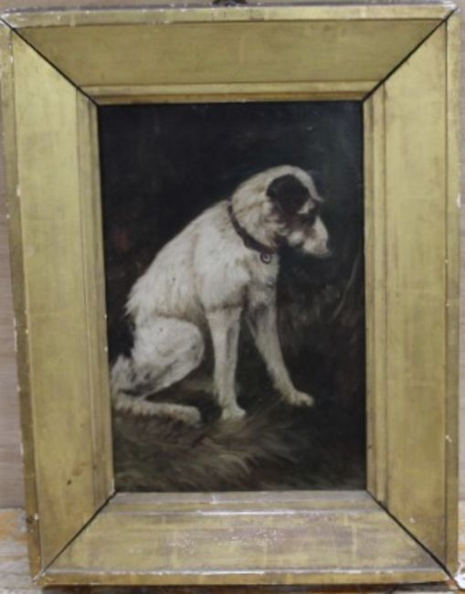 JNO EMMS (XIX). A 19th century study of a seated terrier in the undergrowth, signed lower left, oil on canvas, framed, 34 x 22 cm