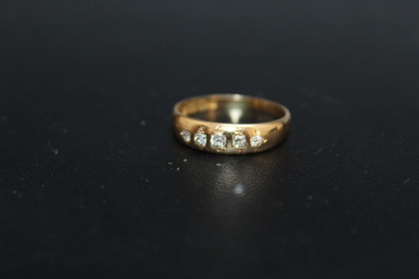 A HALLMARKED 18 CARAT GOLD DIAMOND SET BAND, having 5 diamonds totaling an estimated 0.12 carat, approx weight 3g, ring size P