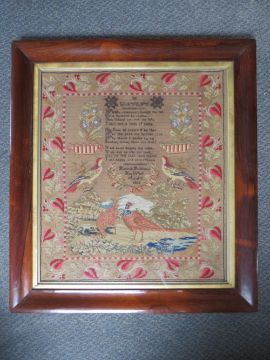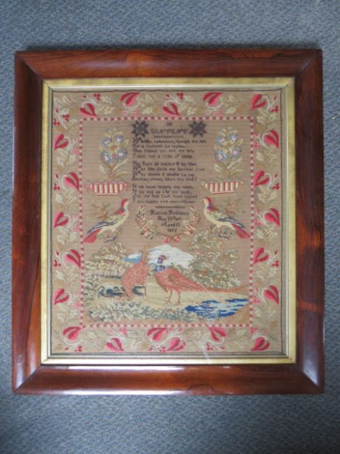 A 19TH CENTURY ENGLISH NEEDLEWORK SAMPLER BY HANNAH ROBINSON AGED 12, 1855, a floral border with pheasants and birds, rosewood framed, 56 x 49.5 cm