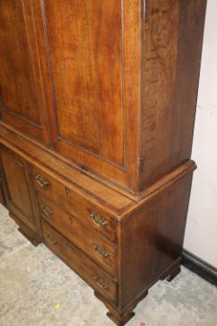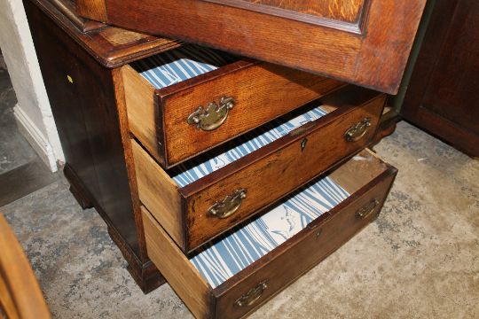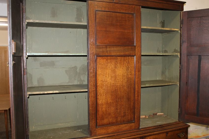 A GEORGIAN OAK AND MAHOGANY HOUSEKEEPERS CUPBOARD, the upper section with three panelled doors opening to adjustable shelves, the lower crossbanded section with a central cupboard flanked by three graduated drawers to each side, raised on shaped bracket feet, H 225 cm, W 186 cm, D 52.5 cm