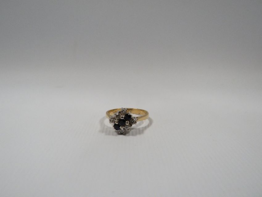 AN 18CT GOLD SAPPHIRE AND DIAMOND DRESS RING, the central row of three sapphires flanked by three diamonds either side, approx weight 3.24 g, ring size L